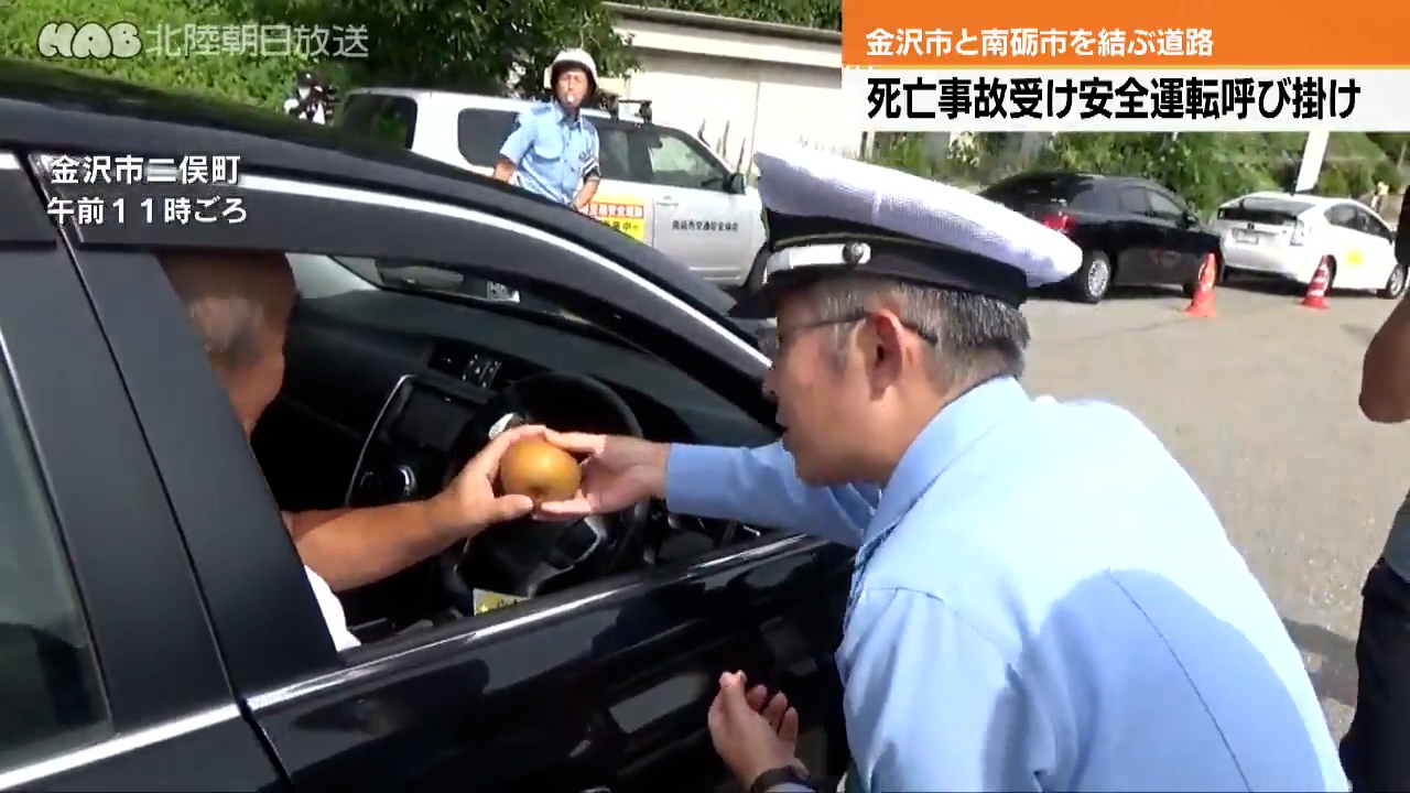 金沢市と富山県南砺市を結ぶ道路で死亡事故が発生したことを受け、安全運転を呼び掛けるキャンペーンが行わ...