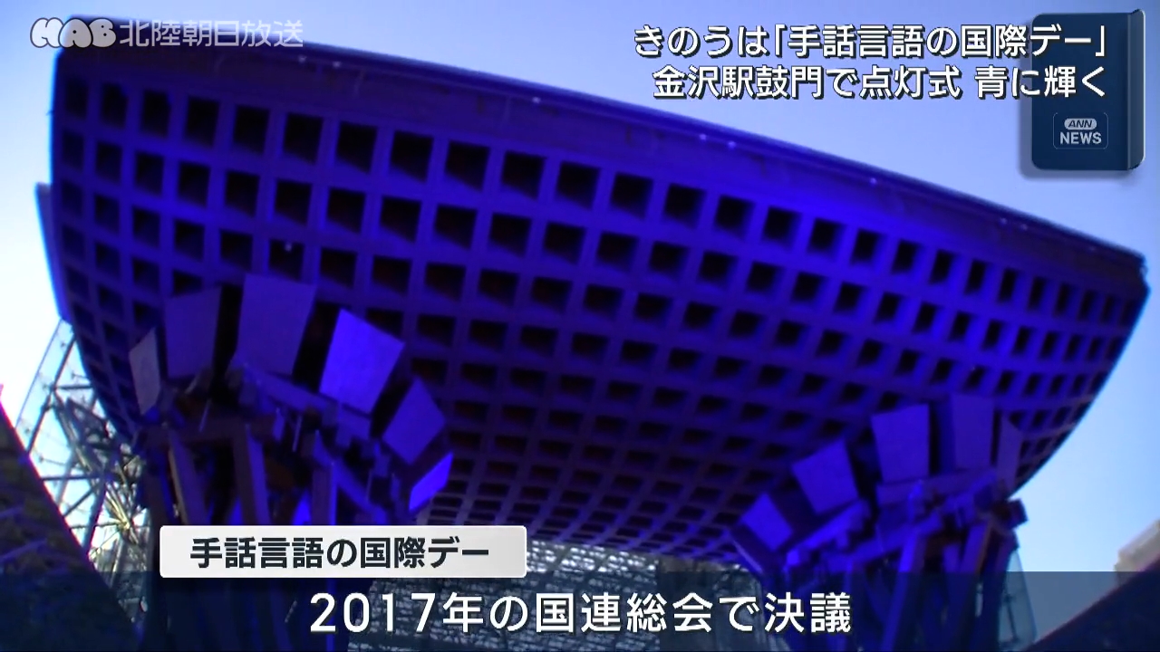 手話言語の国際デー 金沢駅鼓門が青にライトアップ