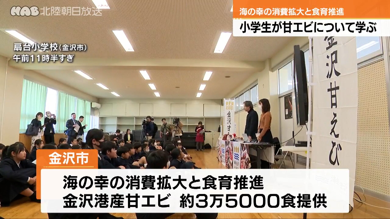 子どもたちが漁師と交流し、地元の甘エビを味わいました。
