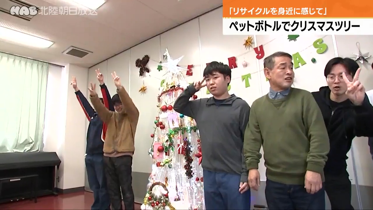 ペットボトルなどのリサイクルを行う会社が野々市市の福祉施設で利用者とともにペットボトルツリーを作りま...