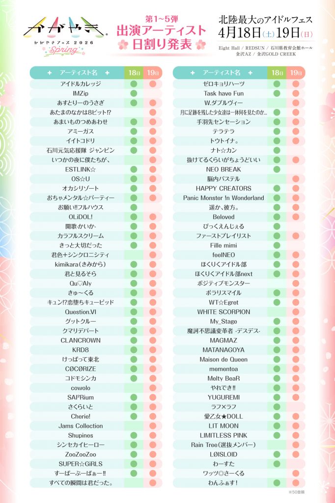 毎回話題となっている、北陸最大級のアイドルフェス「かがやきフェス」。そのスピンオフとなる要注目のライブ、「かがやきフェスSpring2026」第5弾出演アーティスト・22組が発表となりました。今回の発表で、既に参加アーティストはなんと86組!本当に多彩で、素敵なパフォーマンスが繰り広げられそうです。また各出演者の日割り日程も発表されました!