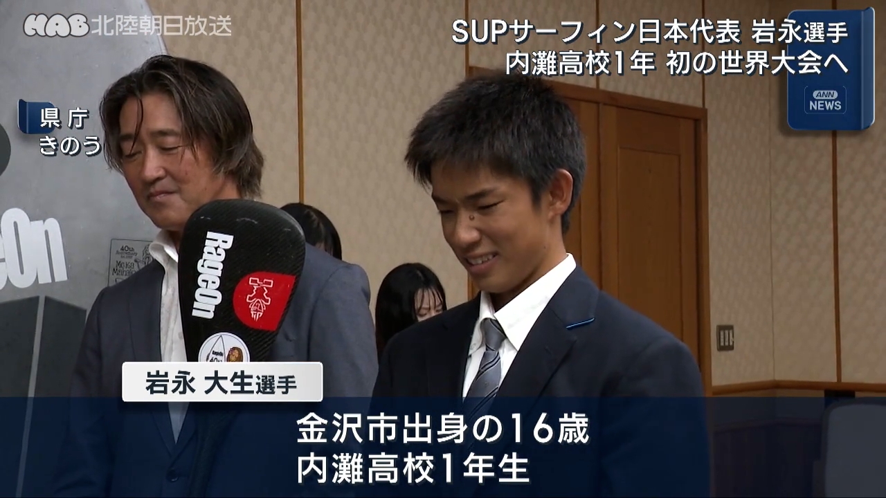 SUPサーフィンの世界大会に出場する内灘高校1年の岩永大生選手が県庁を訪れ