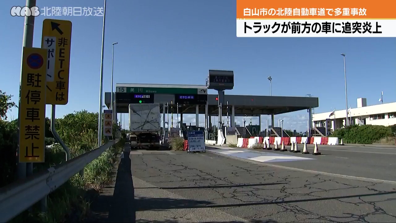 けさ白山市の北陸自動車道でトラックが前を走っていた車に追突・炎上し、あわせて車6台がからむ事故が起き...