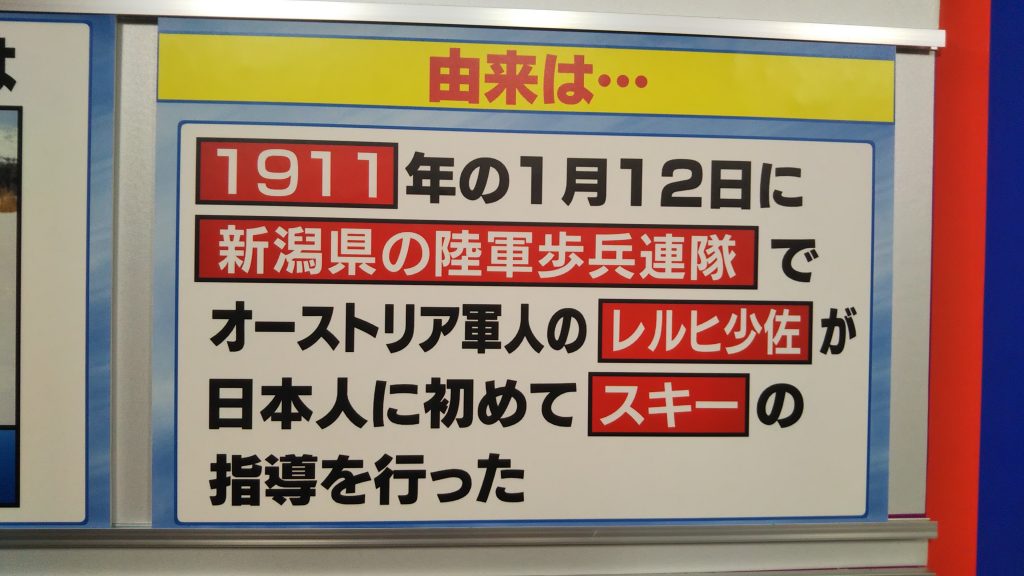 由来は、1911年の1月12日に、新潟県の陸軍歩兵連隊で、オーストリア軍人のレルヒ少佐が、日本人に初めてスキーの指導を行ったということなんです。